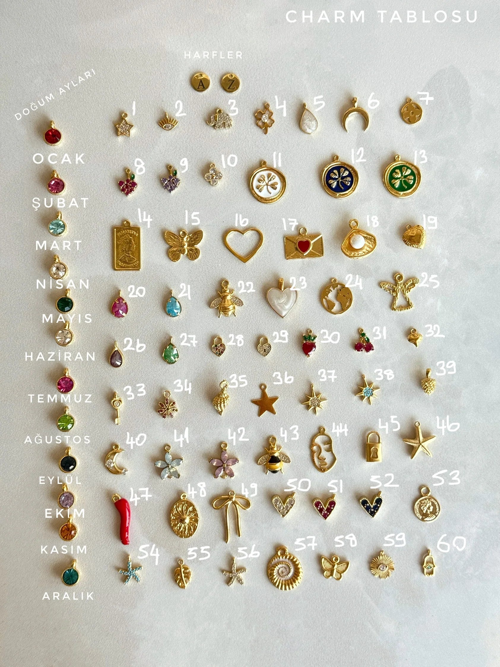 - Charm sayısı ve zinciri seçeneklerden seçtikten sonra seçimlerinizi “kişiselleştirme kutusuna” yazınız. Örnek: 3 charm istiyorum gold tablosu 13 kozalak, 12 beyaz kalp ve 3 üzüm.